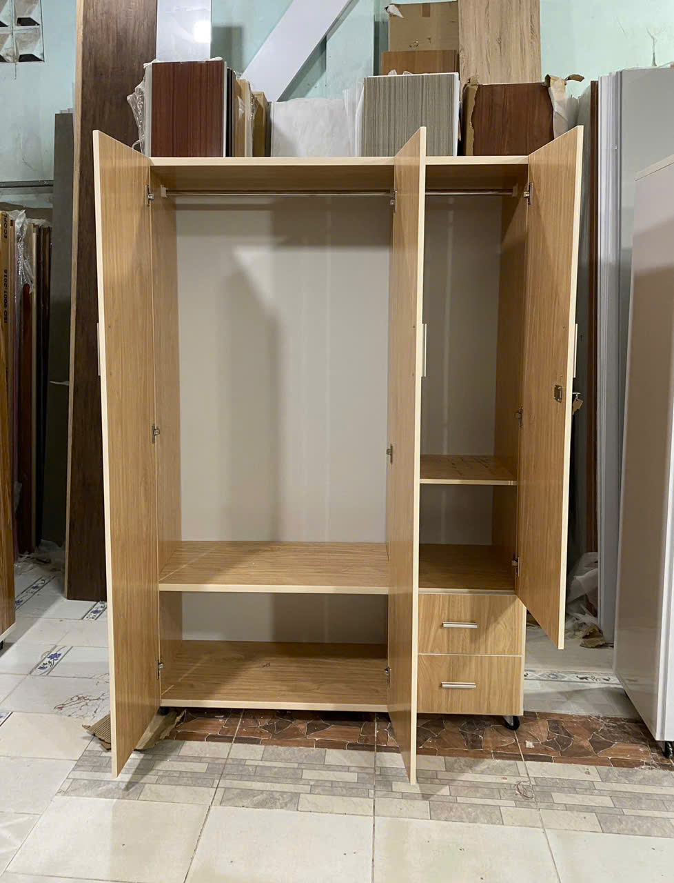 - Phụ kiện đi kèm : Bản lề, ray ngăn kéo, tấm hậu alu, tấm vách ngăn kéo, keo, ốc vít….