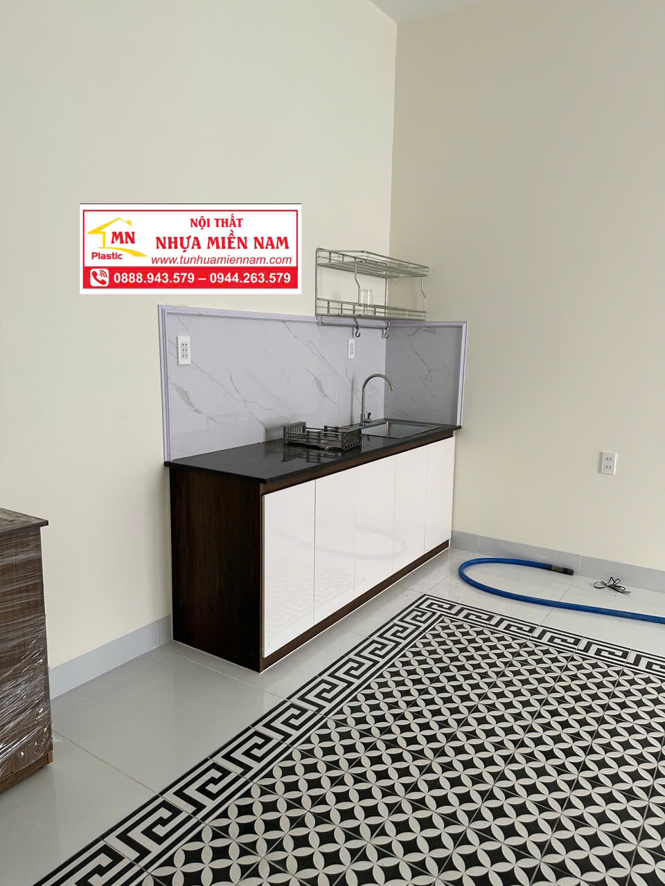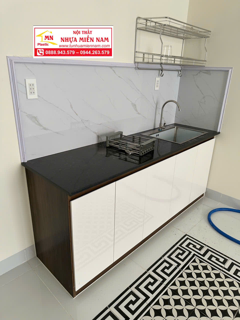 - Bộ bếp dưới bao gồm khung bếp , mặt đá hoa cương đen và bồn vòi.