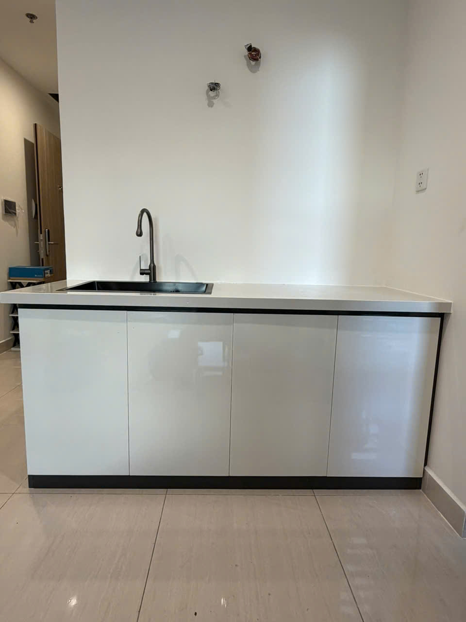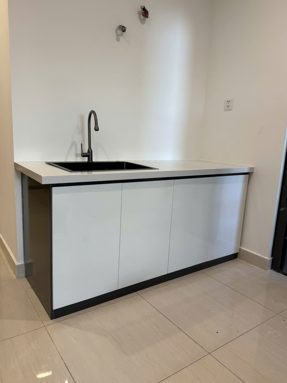 - Bộ bếp dưới bao gồm khung bếp , mặt đá hoa cương trắng nhân tạo và bồn vòi.